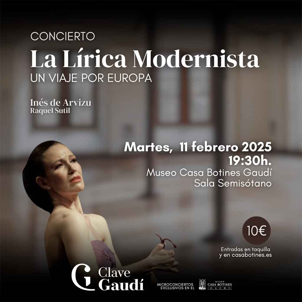 Este ciclo de actuaciones se inaugura con la voz de la soprano Inés de Arvizu, acompañada al piano por Raquel Sutil. Bajo el título ‘La Lírica Modernista. Un viaje por Europa’, el primer concierto de ‘Clave Gaudí’ tendrá lugar el próximo martes 11 de febrero a las 19.30h en el Semisótano de Casa Botines (acceso por c/ Pilotos Regueral). Las entradas pueden adquirirse en taquilla o en la web de Casa Botines (https://www.casabotines.es/producto/concierto-la-lirica-modernista/).