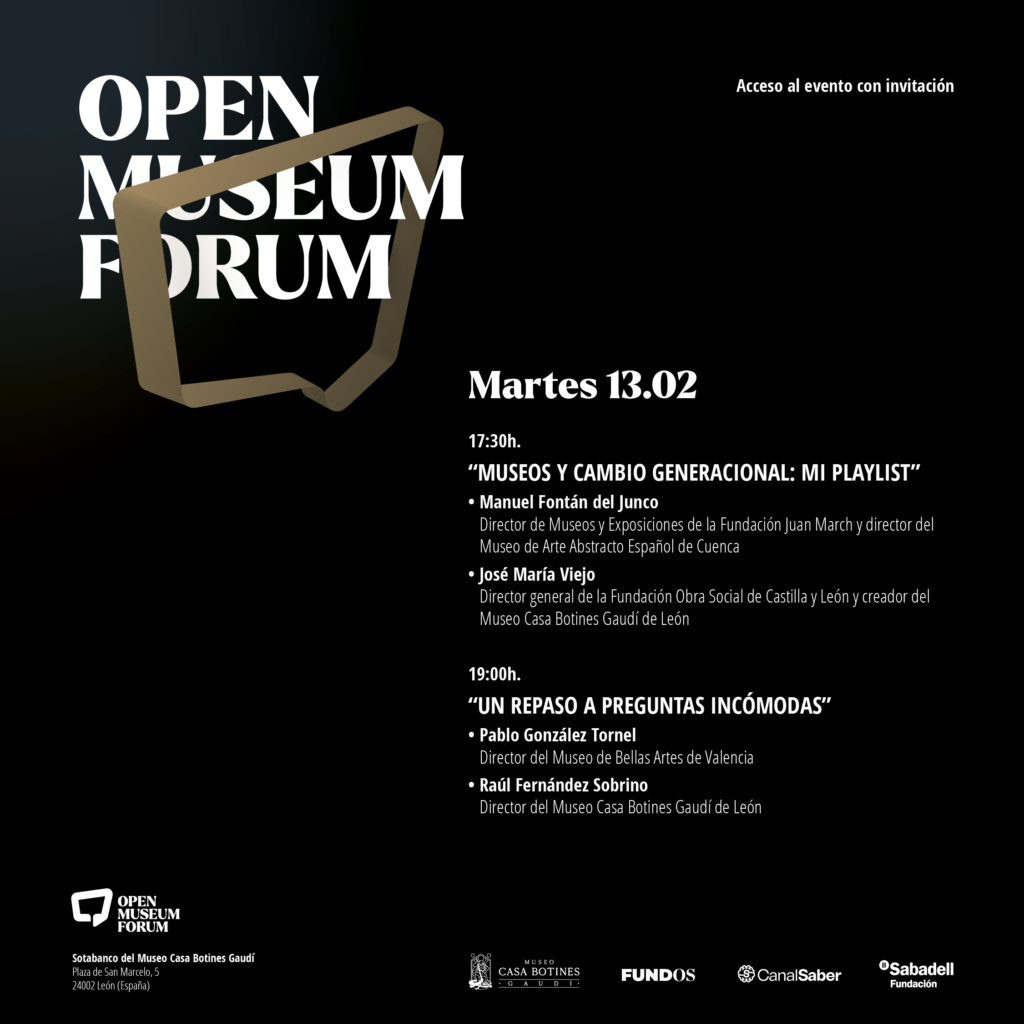El Museo Casa Botines Gaudí pone en marcha este martes día 13 de febrero a partir de las 17.30 horas la primera edición de ‘Open Museum Forum’, un encuentro entre directores de museos españoles que podrá seguirse en diferido a través de Canal Saber, la plataforma audiovisual impulsada por FUNDOS (Fundación Obra Social de Castilla y León). La primera conversación contará con la participación de Manuel Fontán del Junco, director de Museos y Exposiciones de la Fundación Juan March y del Museo de Arte Abstracto Español de Cuenca, quien conversará sobre ‘Museos y cambio generacional: mi playlist’ con José María Viejo, director general de FUNDOS y creador del Museo Casa Botines Gaudí de León.