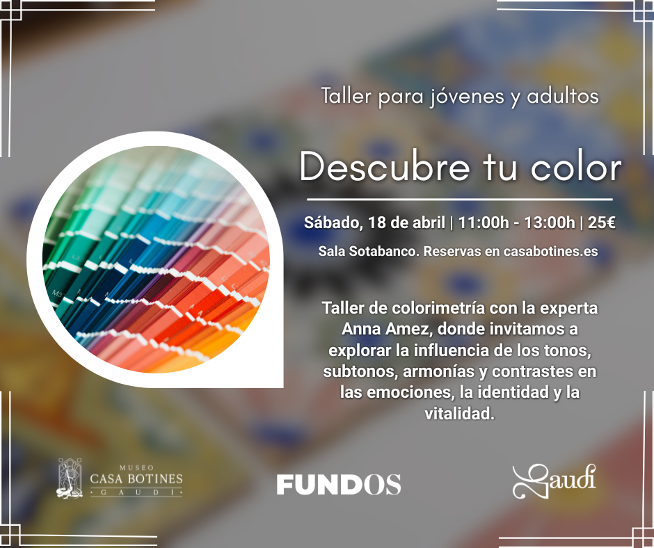 Este sábado 18 de abril a las 11:00 horas el Museo Casa Botines Gaudí organiza un taller de colorimetría para jóvenes y adultos. Con motivo de la exposición temporal ‘Gaudí y el trencadís’ todos los colores que aparecen en la muestra se verán reflejados en las explicaciones de la experta en colorimetría, Anna Amez que será la encargada de impartir este taller en el que los asistentes descubrirán cómo influyen los colores en la imagen personal.