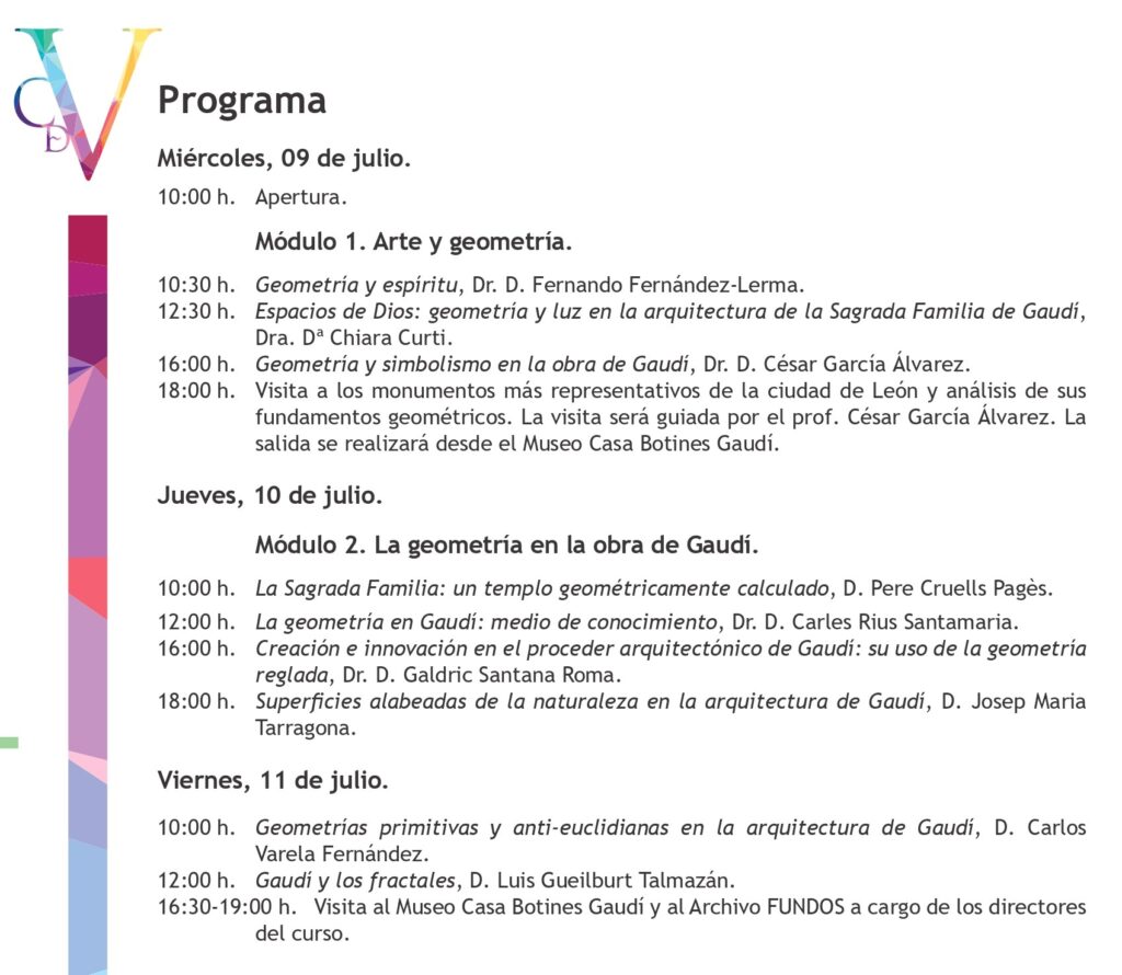 El co-director del curso y conservador jefe del Museo Casa Botines Gaudí, Carlos Varela, ha señalado que acudirán “nueve conferenciantes del máximo nivel procedentes de Barcelona, Madrid y León que tratarán de explicar cómo Gaudí transformó para siempre la arquitectura al introducir el uso sistemático de la geometría reglada y superar la geometría euclidiana, consiguiendo un sorprendente funcionamiento estructural y una estética original y reconocible”.